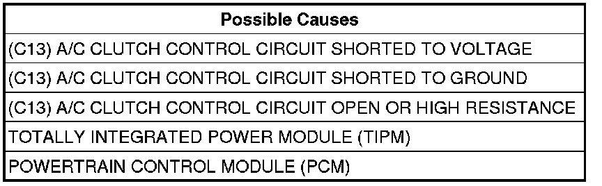 - Repair the (C13) A/C Clutch Control circuit for a short to ground.