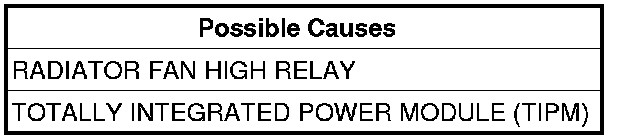 Remove the Radiator Fan High Relay and substitute it with a known good Relay.