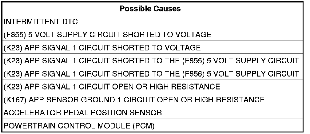 - Repair the (K23) APP Signal 1 circuit for a short to the (F856) 5 Volt Supply circuit.