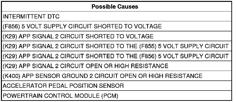 - Repair the (K29) APP Signal 2 circuit for a short to the (F856) 5 Volt Supply circuit.