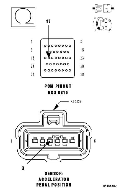 Using the wiring diagram/schematic as a guide, inspect the wiring and connectors between the Accelerator Pedal Position Sensor and the Powertrain Control Module (PCM).