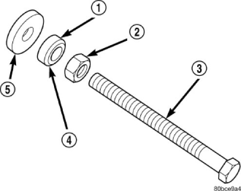 2. Assemble Damper Installer 8512-A as follows, The nut is threaded onto the shaft first (2). Then the roller bearing (1) is placed onto the threaded rod (3) The hardened bearing surface of the bearing (1) MUST face the nut (2). Then the hardened washer (5) slides onto the threaded rod (3). Once assembled coat the threaded rod's threads with MOPAR(R) Nickel Anti-Seize or (Loctite No. 771).