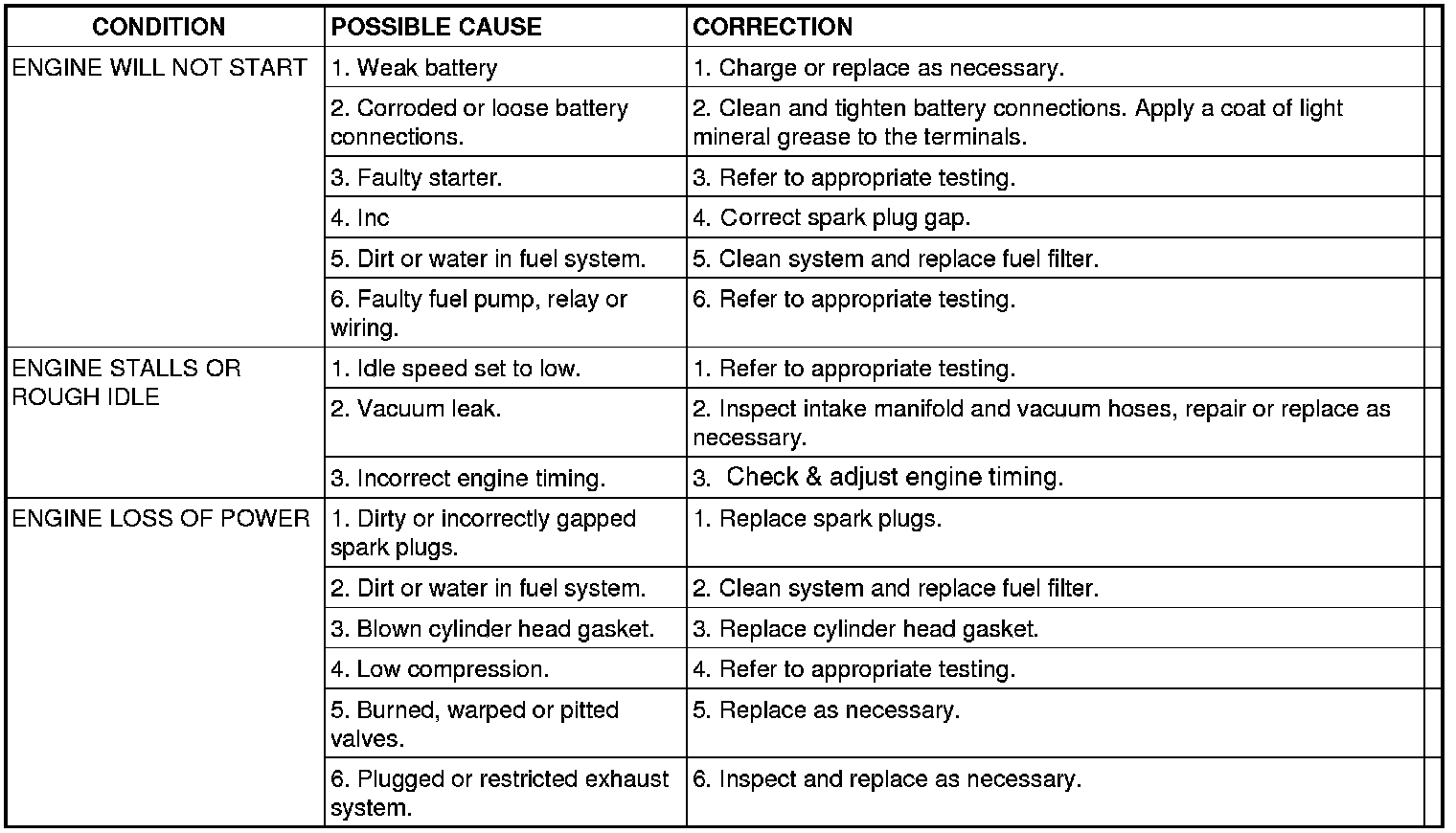 ENGINE PERFORMANCE DIAGNOSTIC TABLE