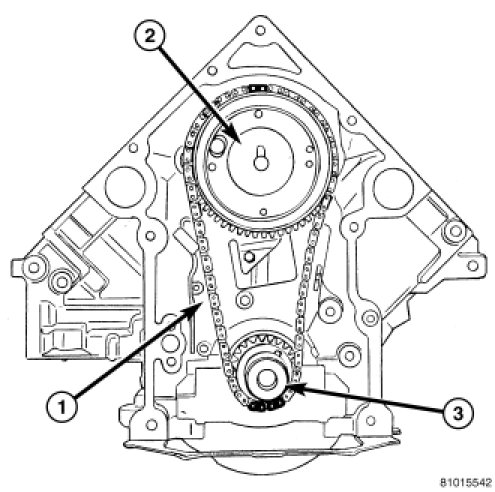 CAUTION: The timing chain must be installed with the single plated link aligned with the dot and or paint marking on the camshaft sprocket. The crankshaft sprocket is aligned with the dot and or paint marking on the sprocket between two plated timing chain links.