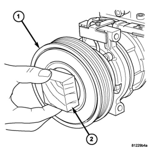 3. Install the pulley and bearing assembly (1) onto the front of the A/C compressor. If necessary, tap the pulley gently with a block of wood (2) placed on the pulley friction surface.