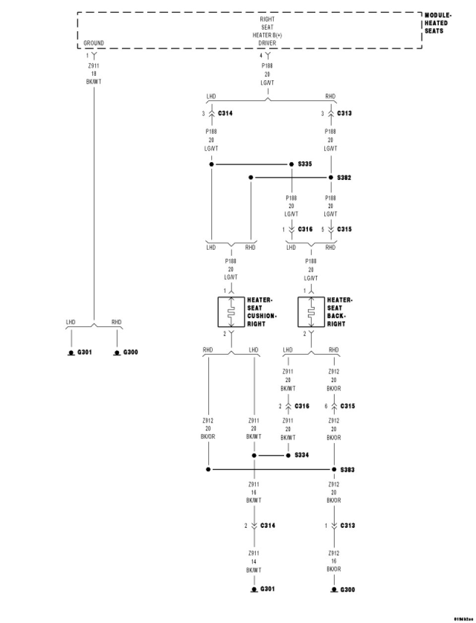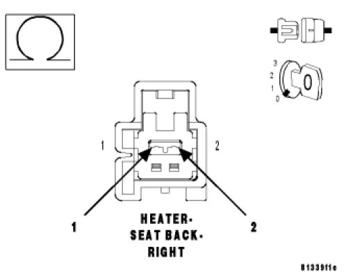 Check the resistance of the seat back heater element by measuring between the (P188) Right Seat Heater B(+) Driver and the (Z911/Z912) Ground circuit at the Right seat back heater connector.