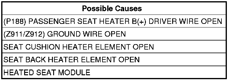 - Repair the (P188) Right Seat Heater B(+) Driver circuit for an open.