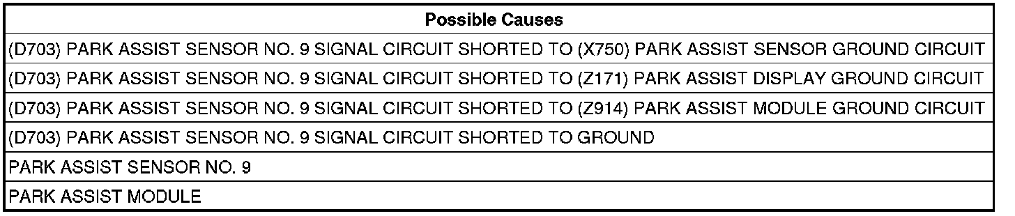 - Repair the (D703) Park Assist Sensor No. 9 Signal circuit for a short to ground.