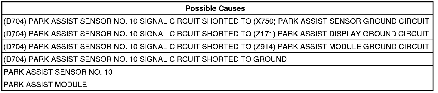 - Repair the (D704) Park Assist Sensor No. 10 Signal circuit for a short to ground.