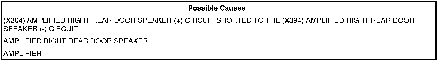 - Repair the (X304) Amplified Right Rear Door Speaker (+) circuit, and the (X394) Amplified Right Rear Door Speaker (-) circuit for a short together.
