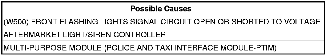 The Multi-Purpose Module (Police And Taxi Interface Module-PTIM) has detected the Front Flashing Lights Signal circuit above a calibrated value.