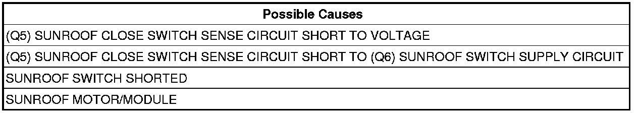 - Repair the (Q5) Sunroof Close Switch Sense circuit for a short to voltage.