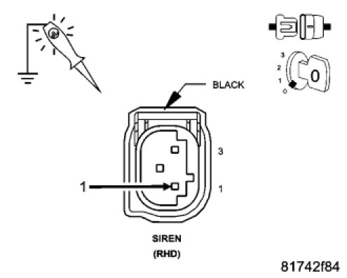 Using a 12-volt test light connected to 12-volts, check the Ground circuit at the siren connector.