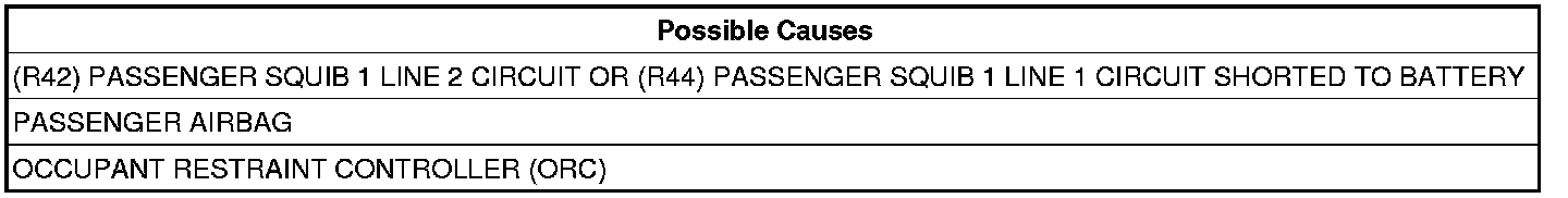 3. CHECK (R42) PASSENGER SQUIB 1 LINE 2 CIRCUIT AND (R44) PASSENGER SQUIB 1 LINE 1 CIRCUIT FOR A SHORT TO BATTERY