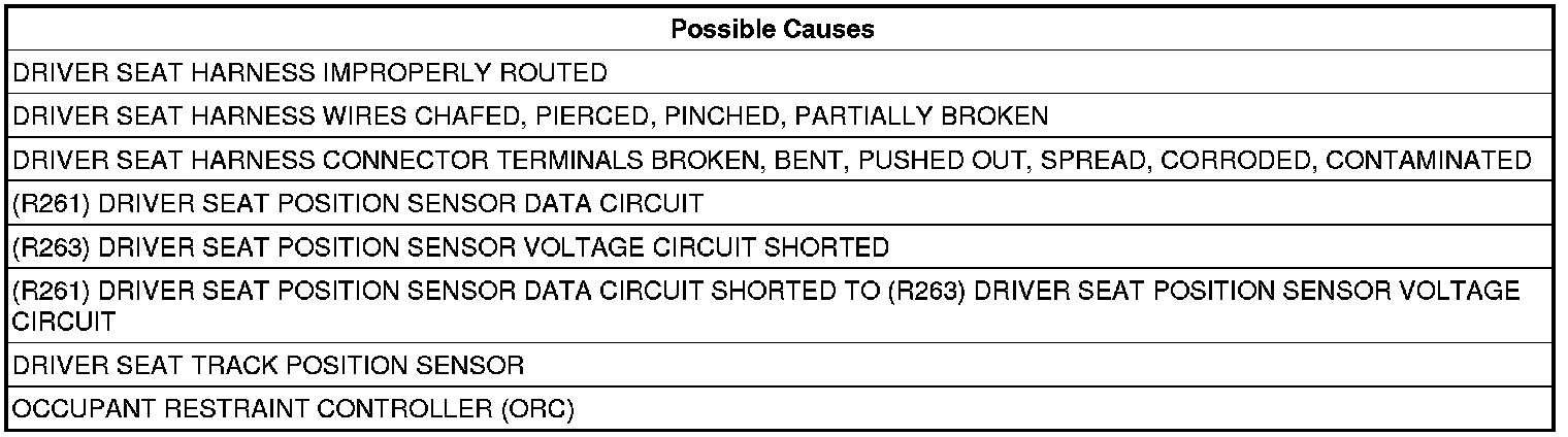 Measure the resistance between the (R261) Driver Seat Position Sensor Data circuit and the (R263) Driver Seat Position Sensor Voltage circuit in the Driver Seat Track Position Sensor connector.