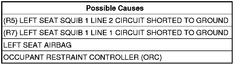 The Occupant Restraint Controller (ORC) monitors the resistance of the Left Seat Airbag circuits. If low resistance is detected in the Left Seat Airbag circuits the ORC will set this DTC.