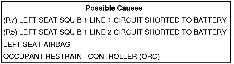 The Occupant Restraint Controller (ORC) monitors the voltage on the Left Seat Airbag circuits. If voltage is detected on the Left Seat Airbag circuits the ORC will set this DTC.