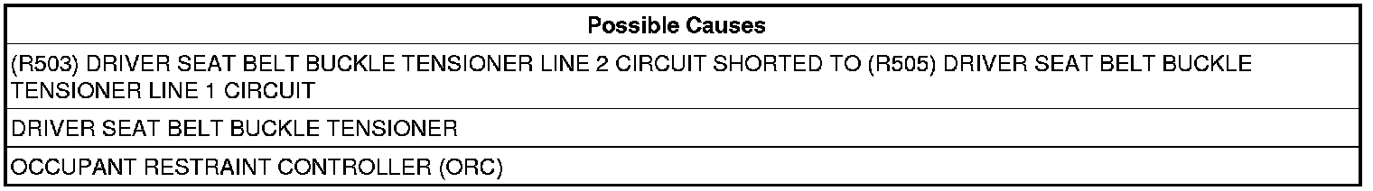 - Repair or replace the (R505) Driver Seat Belt Buckle Tensioner Line 1 circuit for a short to the (R503) Driver Seat Belt Buckle Tensioner Line 2 circuit.