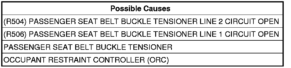 - Repair or replace the (R504) Passenger Seat Belt Buckle Tensioner Line 2 circuit for an open.