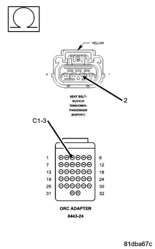 Measure the resistance of the (R506) Passenger Seat Belt Buckle Tensioner Line 1 circuit between the Passenger Seat Belt Buckle Tensioner connector and the Load Tool ORC 8443-28 Adaptor.