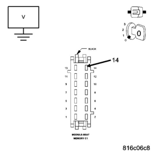Using a 12-volt test light connected to 12-volts, probe the (G14) Adjustable Pedals Sensor Signal circuit at the Memory Seat Module C1 harness connector.