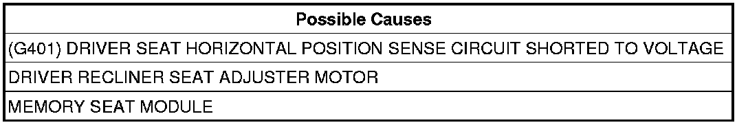 - Inspect the position sense wire for a possible intermittent short to voltage from another circuit, if OK replace the Driver Horizontal Seat Adjuster Motor assembly.