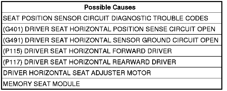 - Repair the (G401) Driver Seat Horizontal Position Sense circuit for an open.
