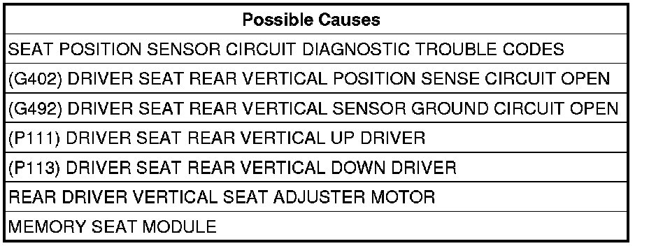 - Repair the (G402) Driver Seat Rear Vertical Position Sense circuit for an open.