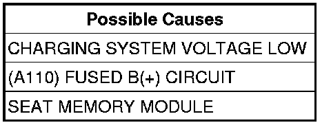 This code is set immediately after the Seat Memory Module receives a low charging system voltage message over the CAN B Bus or detects voltage under 9.5 volts on the (A110) Fused B(+) circuit.