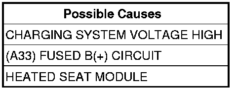 - Set Condition: This code is set immediately after the Heated Seat Module receives a high charging system voltage message over the CAN B Bus or detects voltage over 15 volts on the (A33) Fused B(+) circuit.