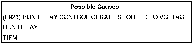 The TIPM will set this DTC within 500ms if the (F923) Run Relay Control circuit voltage is shorted to voltage.