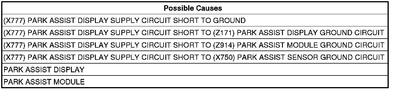 - Repair the (X777) Park Assist Display Supply circuit for a short to ground.