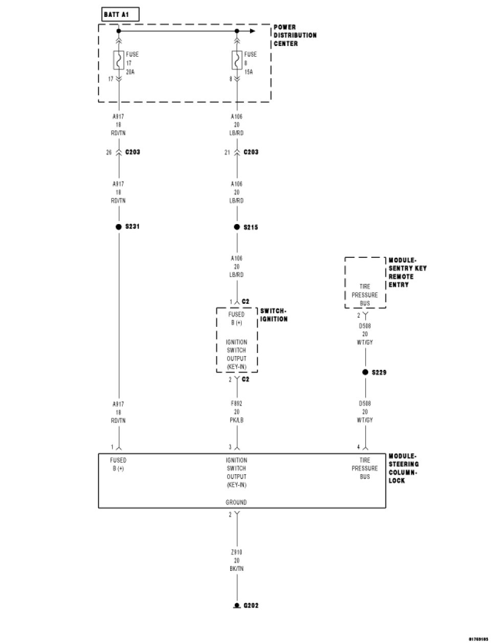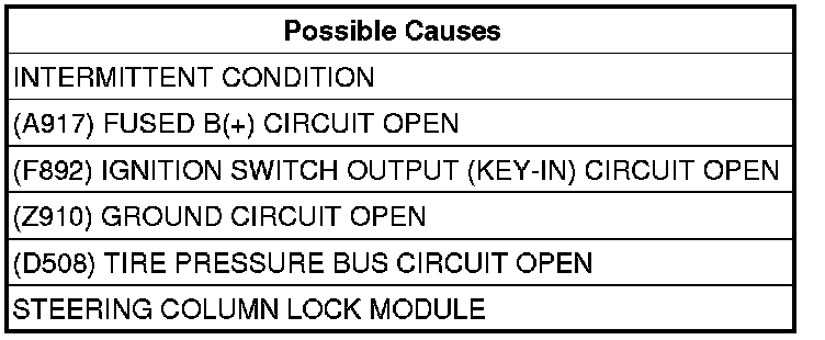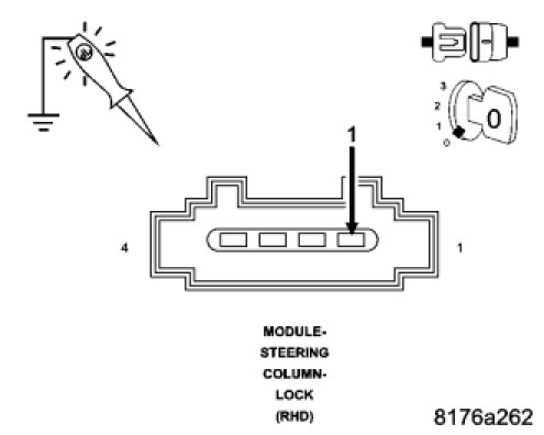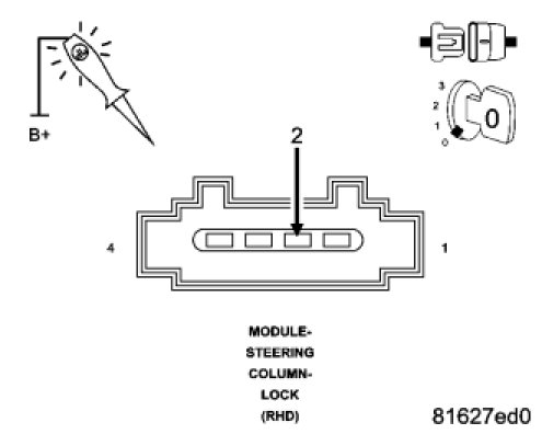 Using a 12-volt test light connected to ground, check the (A917) Fused B(+) circuit in the Steering Column Lock Module connector.