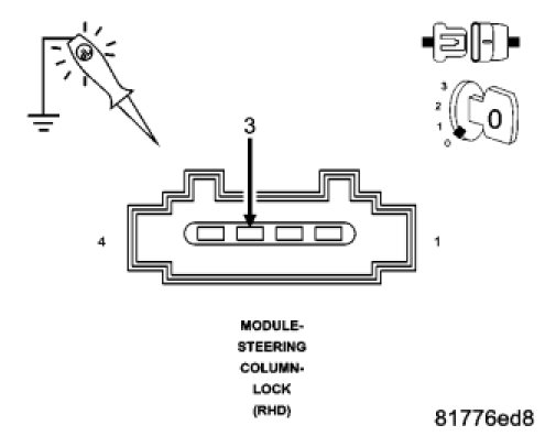 Using a 12-volt test light connected to ground, check the (A892) Ignition Switch Output (Key-In) circuit in the Steering Column Lock Module connector.