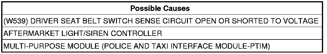 Measure the voltage of the (W539) Driver Seat Belt Switch Sense circuit between ground and the Multi-Purpose Module (Police And Taxi Interface Module-PTIM) C2 harness connector.