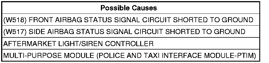 The Multi-Purpose Module (Police And Taxi Interface Module-PTIM) has detected the Front or Side Airbag Status Signal circuits below a calibrated value.