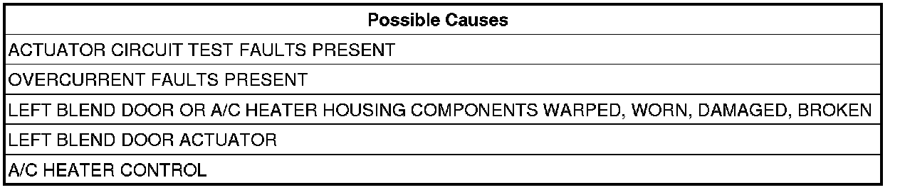 The purpose of actuator calibration is to determine the total span of door travel between physical stops. To calibrate the actuator, the A/C Heater Control first moves the door to its soft stop, and then counts the number of pulses it takes to move the door to its other stop. An expected range of span is stored in the control's memory. If the A/C Heater Control detects too many commutator pulses when calibrating the left blend door, this DTC will set.