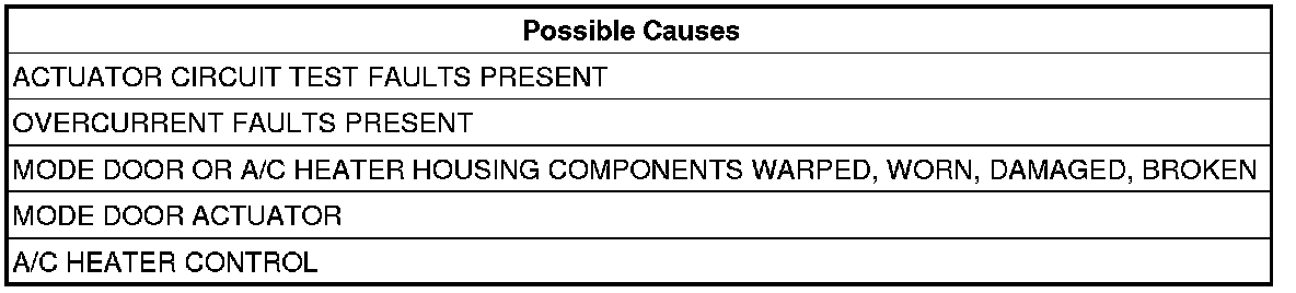The purpose of actuator calibration is to determine the total span of door travel between physical stops. To calibrate the actuator, the A/C Heater Control first moves the door to its soft stop, and then counts the number of pulses it takes to move the door to its other stop. An expected range of span is stored in the control's memory. If the A/C Heater Control detects too many commutator pulses when calibrating the mode door, this DTC will set.
