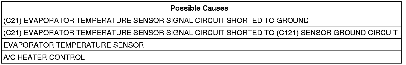 - Repair the (C21) Evaporator Temperature Sensor Signal circuit for a short to ground.