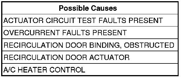 The purpose of actuator calibration is to determine the total span of door travel between physical stops. To calibrate the actuator, the A/C Heater Control first moves the door to its soft stop, and then counts the number of pulses it takes to move the door to its other stop. An expected range of span is stored in the control's memory. If the A/C Heater Control detects too few commutator pulses when calibrating the recirculation door, this DTC will set.