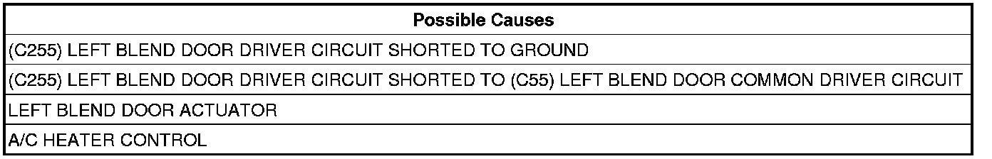 - Repair the (C255) Left Blend Door Driver circuit for a short to the (C55) Left Blend Door Common Driver circuit.