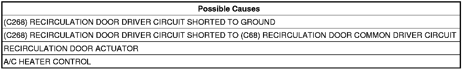 - Repair the (C268) Recirculation Door Driver circuit for a short to ground.