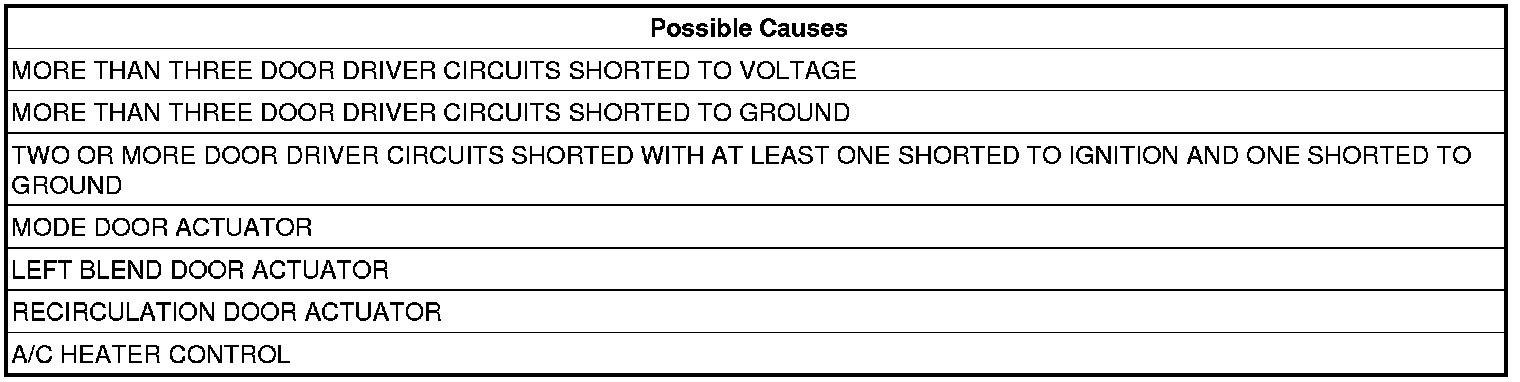 If the A/C Heater Control detects more than three door driver circuits shorted in the same direction (e.g. four door driver circuits all shorted to ground) or if two or more door driver circuits are shorted with at least one door driver circuit shorted to voltage and one door driver circuit shorted to ground.