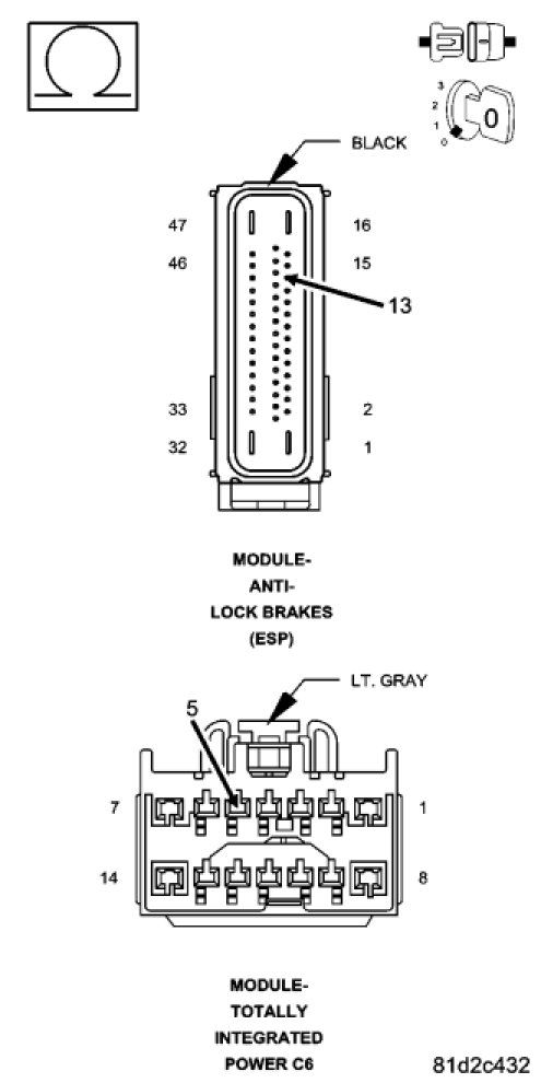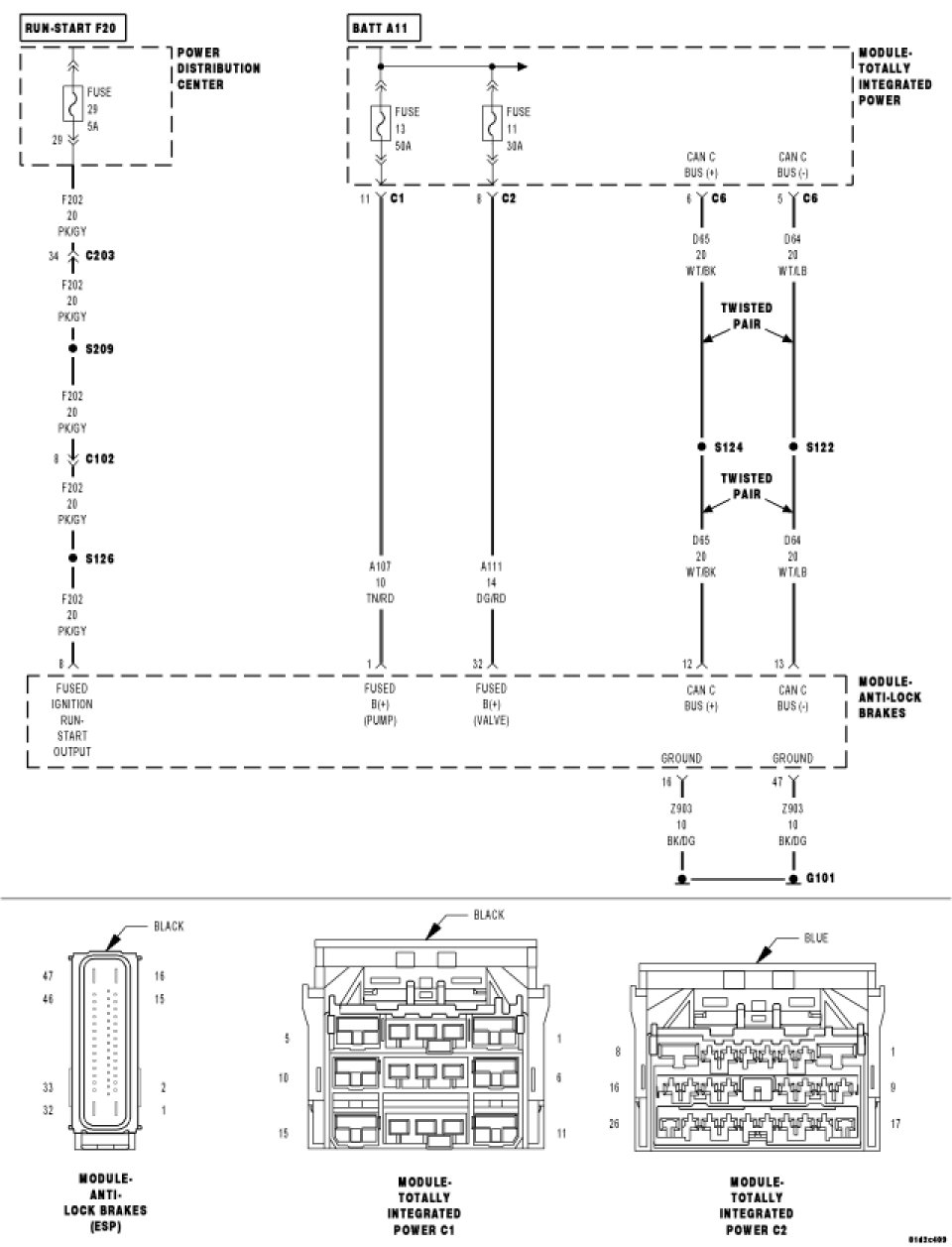 Measure the resistance of the (D64) CAN C Bus (-) circuit between the TIPM C6 harness connector and the Antilock Brake Module harness connector.