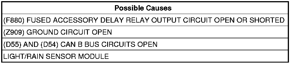 - Repair the (F880) Fused Accessory Delay Relay Output circuit for an open or short.
