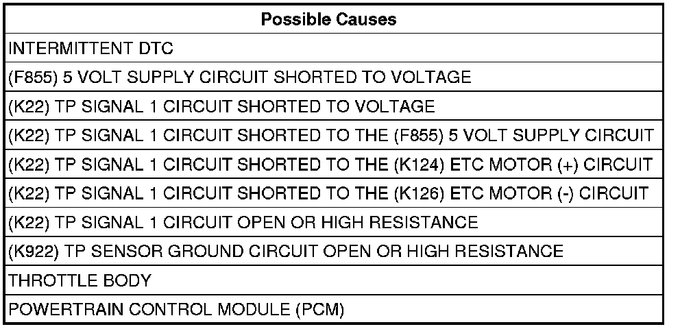 - Repair the (K22) TP Signal 1 circuit for a short to the (K126) ETC Motor (-) circuit.