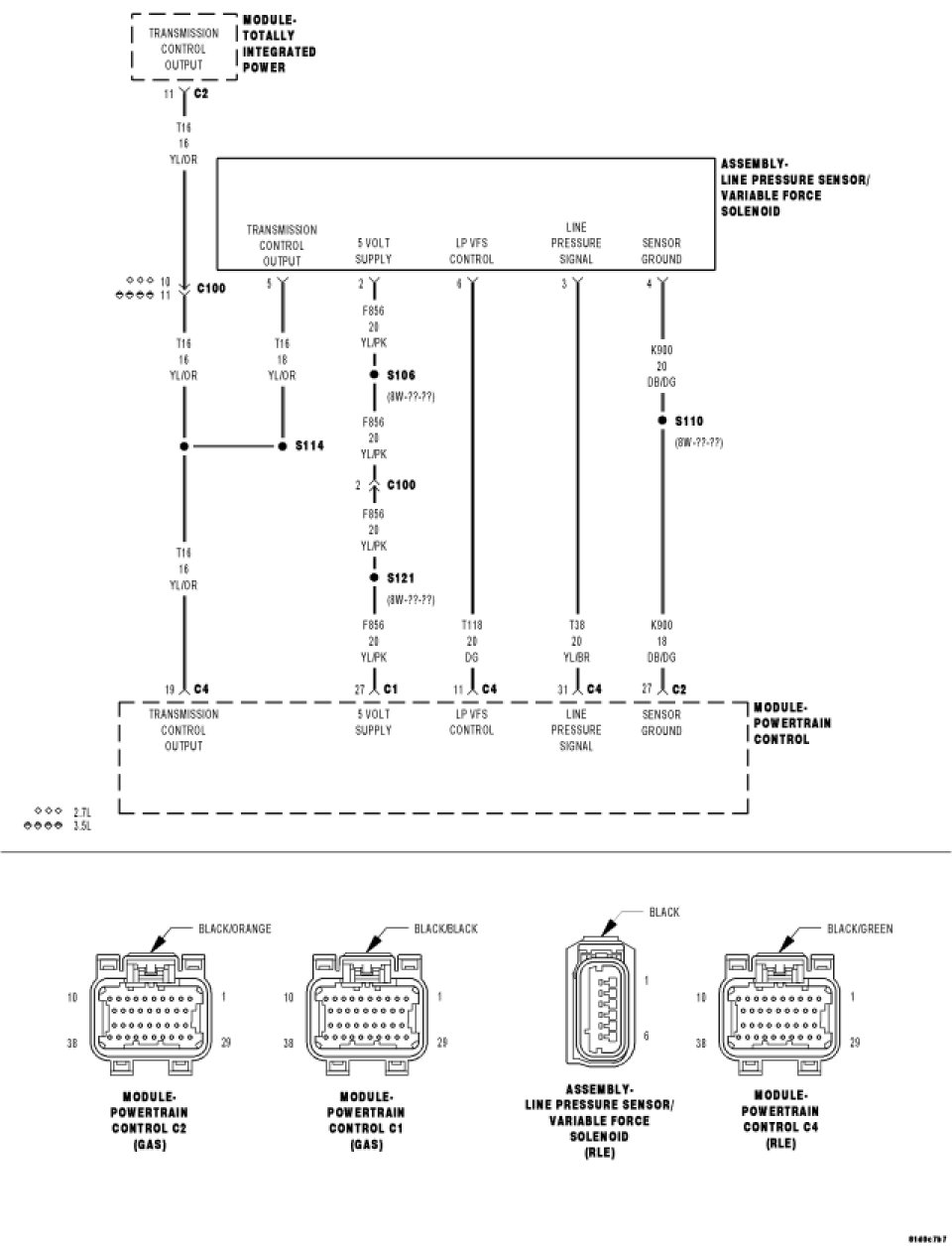 Line pressure is measured by the Line Pressure Sensor (LPS) and regulation is achieved by changing the duty cycle of the Pressure Control Solenoid (PCS) controlled by the Transmission Control System. (5% duty cycle = solenoid off = Max line pressure, 62% duty cycle = solenoid on = Min line pressure). The Transmission Control System calculates the desired line pressure based on inputs from both the engine and transmission.