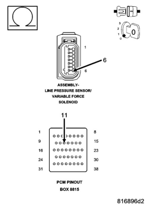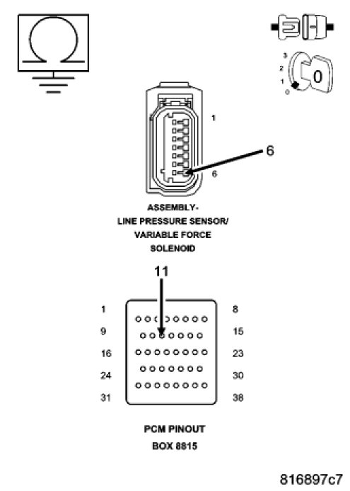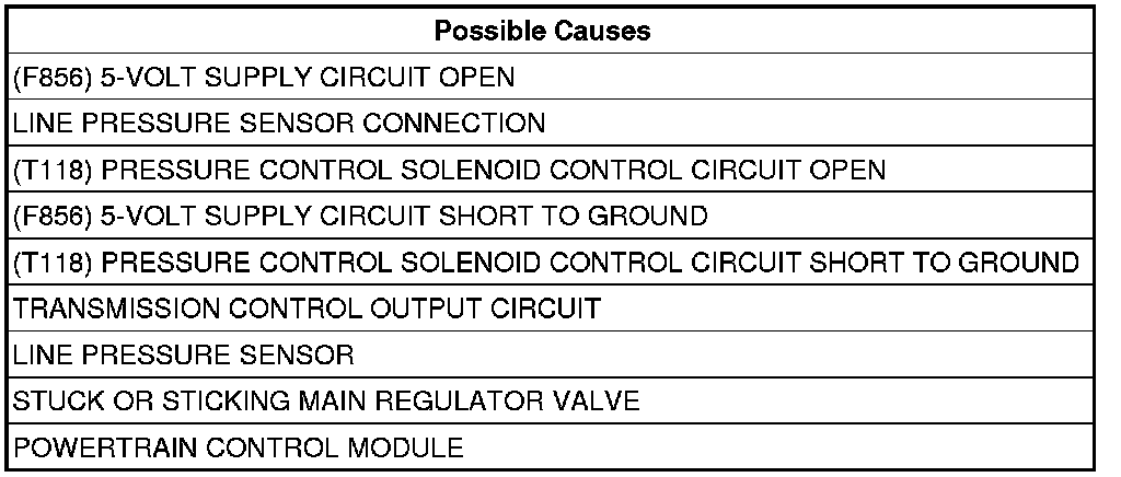 The PCM continuously monitors Actual Line Pressure. If the Actual Line Pressure reading is greater than the highest Desired Line Pressure ever used in the current gear, while the Pressure Control Solenoid duty cycle is at or near its maximum value (which should result in minimum line pressure), the DTC will set.