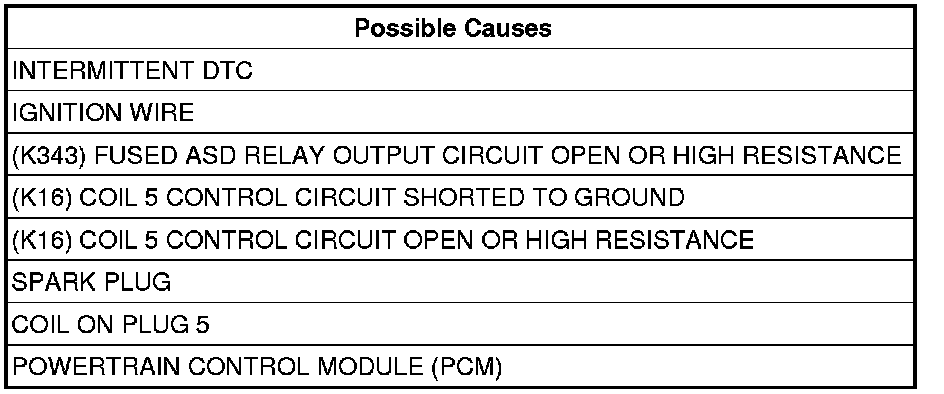 Using a 12 volt test light connected to ground, check the (K343) Fused ASD Relay Output circuit in the Coil On Plug 5 harness connector.