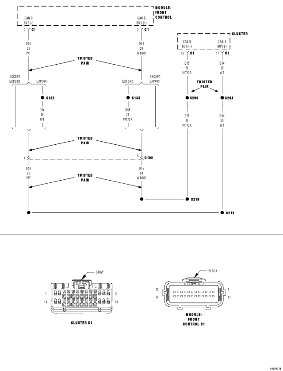 Measure the resistance of the (D55) Can B Bus (+) circuit between the Front Control Module C1 harness connector and the Instrument Cluster C1 harness connector.